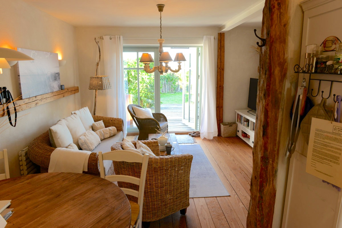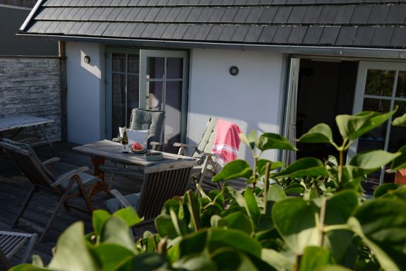 Ob Frühstück, eine ruhige Yoga Einheit oder ein Glas Wein im Sonnenuntergang – auf der großen Terrasse lässt sich der Tag entspannt verbringen. Der Garten steht euch mit zur Verfügung und wird gemeinschaftlich mit den zwei weiteren Wohnungen genutzt – von hier aus seid ihr in wenigen Schritten am Strand.
