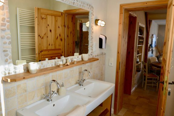 Das moderne Duschbad mit Doppelwaschbecken, Fußbodenheizung und schönen Fliesen rundet den Komfort ab.
