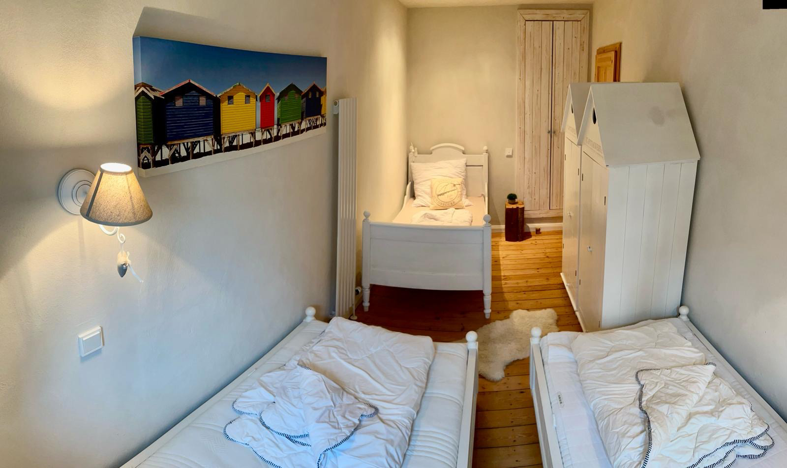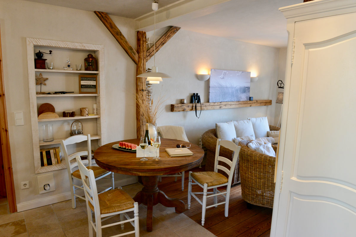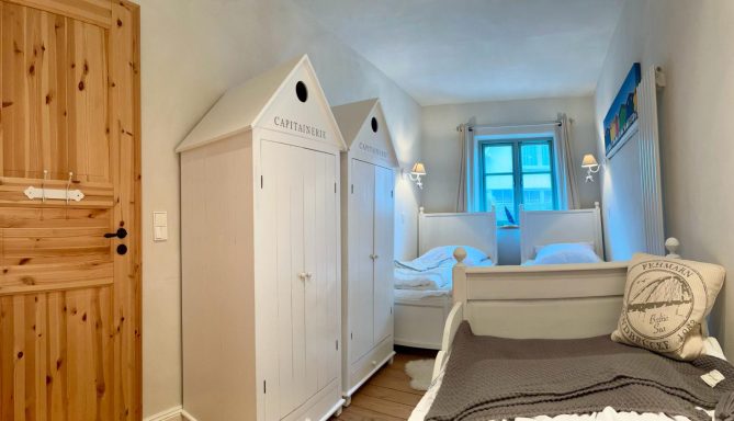 Westwind liegt im hinteren Teil des alten (ursprünglichen) Kapitänshauses. Zwei Schlafzimmer bieten Platz für fünf Personen: eines mit gemütlichem Boxspringbett, das andere mit drei Einzelbetten.